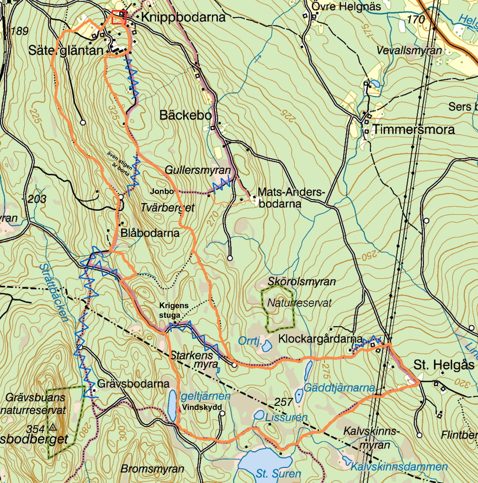 Entlang des Weges werden schöne Orte durchlaufen, darunter ein Strom, der durch ältere Wälder fließt, der Windschutz am Igeltjärnen und das Naturschutzgebiet Skörolsmyran.