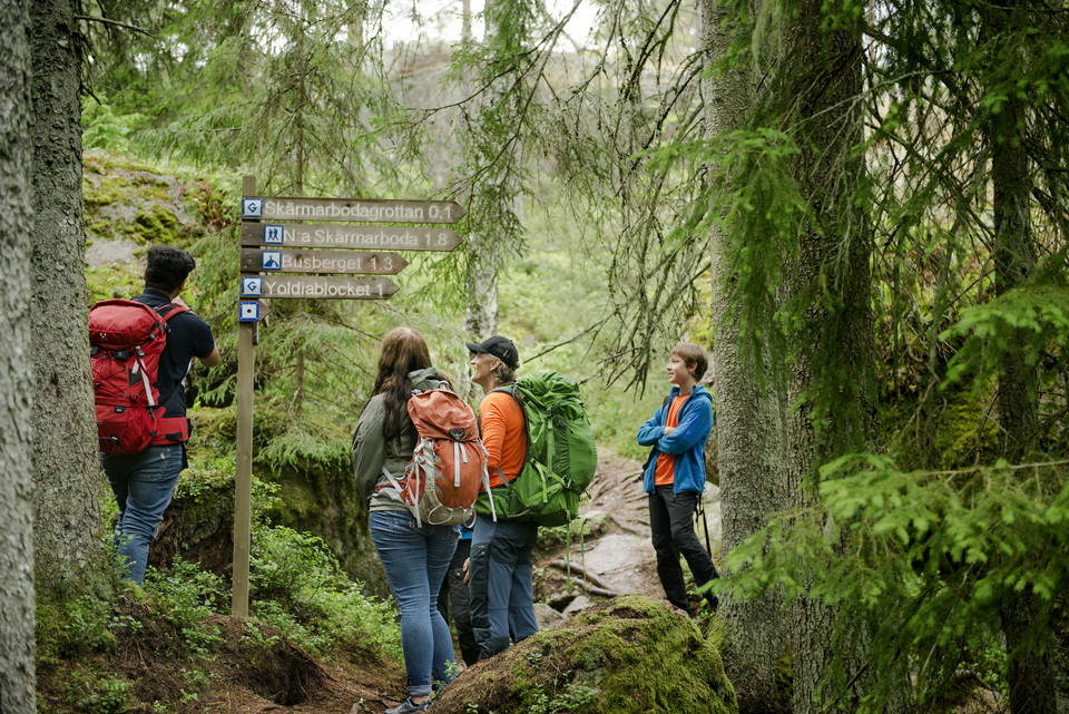 Der blau gekennzeichnete Weg durch das Naturschutzgebiet Ambogerg verbindet die Etappen 7 und 8. Auf dem steilen Amboberg können Sie die Gelegenheit zu einer Pause mit schöner Aussicht nutzen. Während Ihrer Wanderung haben Sie auch die Möglichkeit, die Überdeckungshöhlen in Skämarboda zu erforschen.