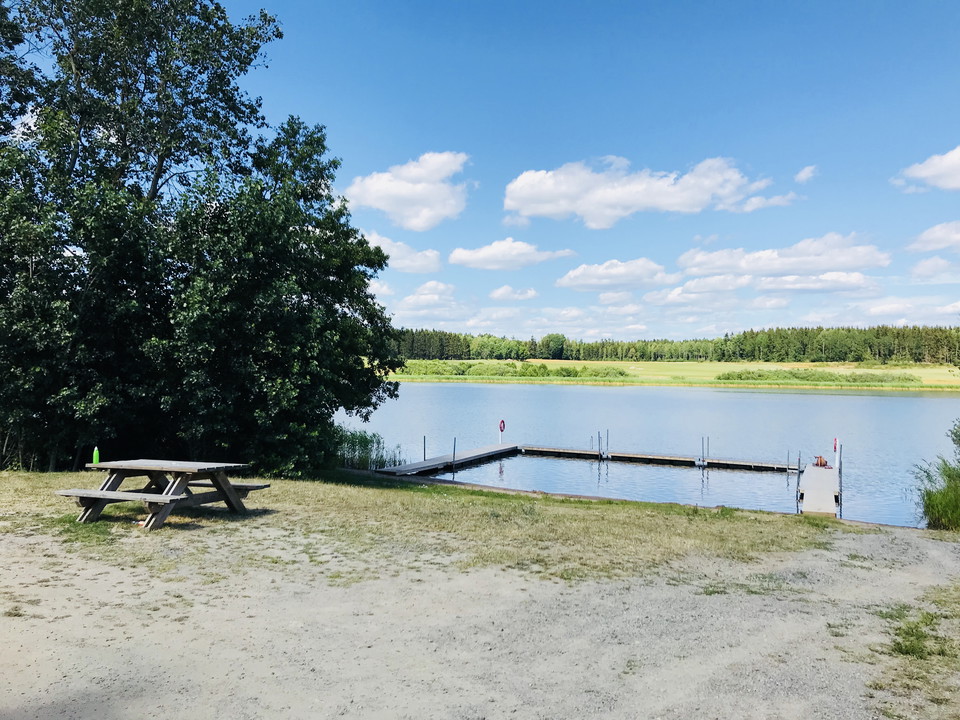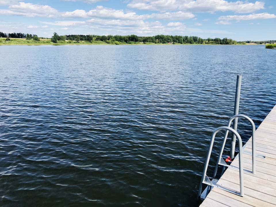 var vid björkvik i dag för att bada. folktomt trots stekhett och sol. kanske berodde det på att båda bryggornas ändar låg en bra bit ute och under vattnet ….. det luktade ruttet av gräs/sandstranden också. kanske alger ?? vi vände och åkte till Storsjön i stället.