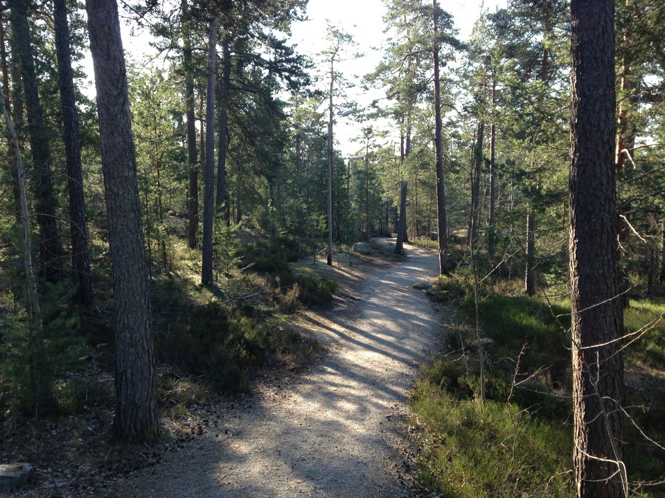 A lighted trail with a surface smooth enough to pull a stroller (if you can make it up the slopes). The loop starts from a place behind Björknäs IP and goes through forest, next to Tollare swamp, and through residential areas. The loop contains some steep slopes. No markings except for the lighting.
