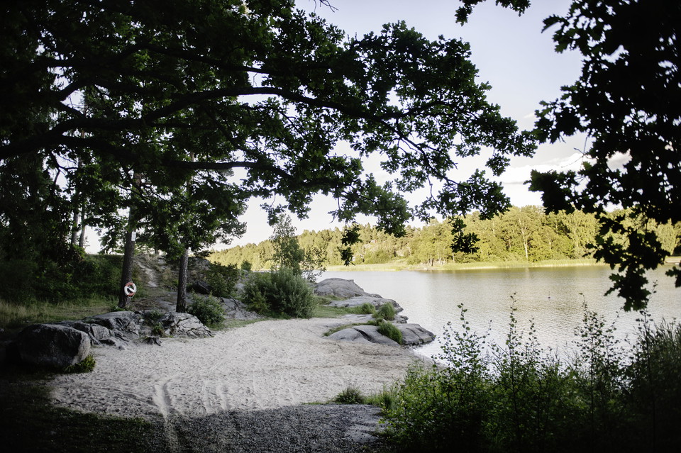 Weniger Strand bei Drevviken. Es ist gut vom Sandstrand zu schwimmen, aber auch von Fersen und Klippen. Parken ist da.