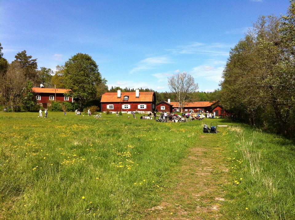 Der Grill ist auf dem Feld hinter Dahlgrensgården in der Mitte des Dorfes Tyresta. Überqueren Sie den Innenhof bis zum Becken und Sie werden es finden.