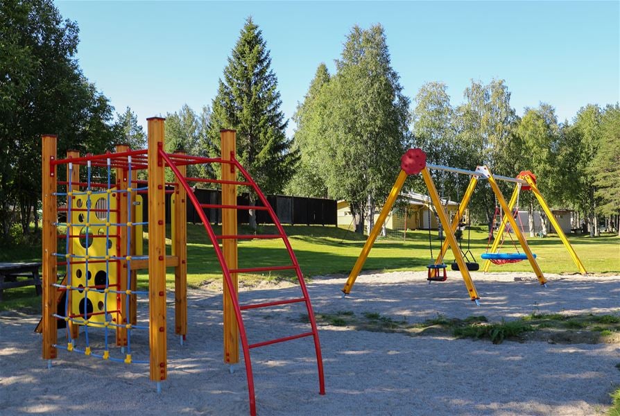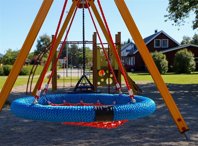 Im Osten Stensel gibt es einen Spielplatz in einem grünen Bereich mit klassischer Spielplatzausrüstung, Schaukeln und Kletterposition.