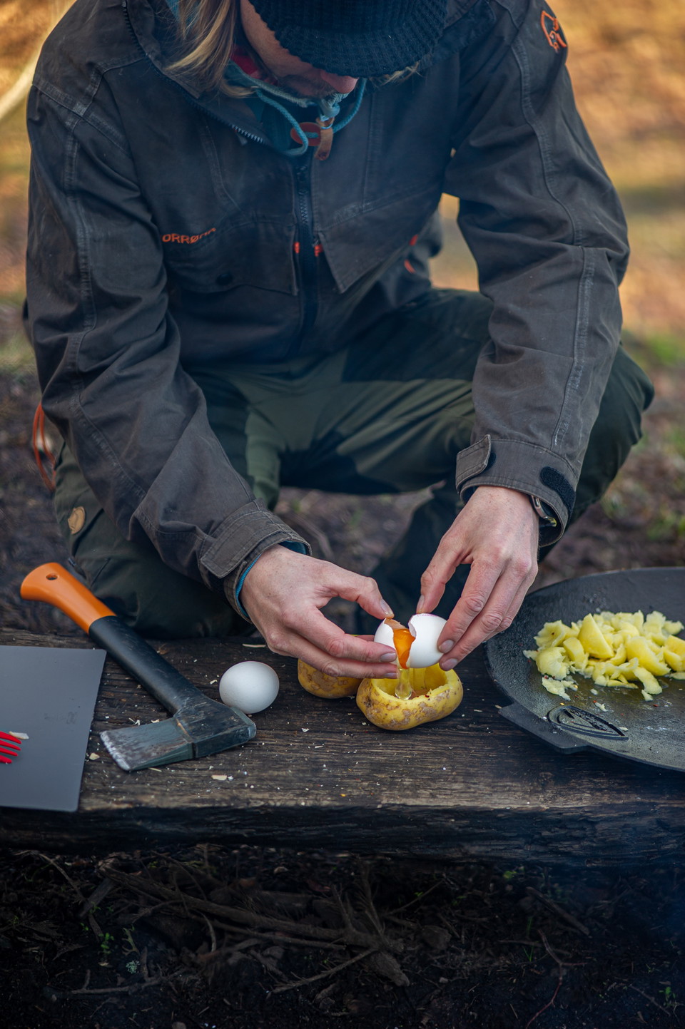 förrätt blir det äggröra som vi tillagar i en potatis. Huvudrätten blir en viltskavsgryta med
