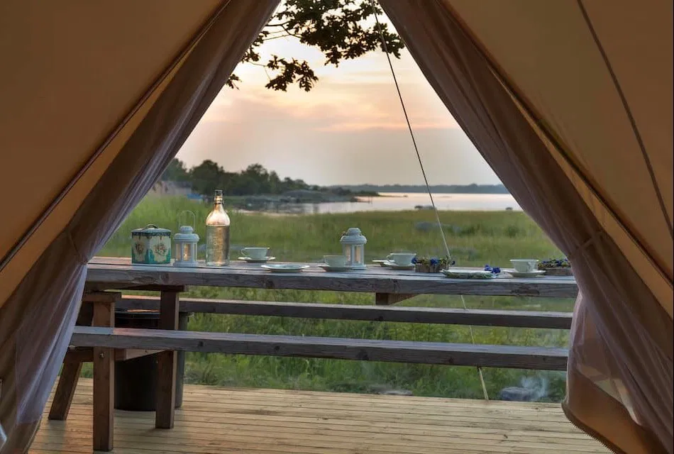 Glamping tents with sea views, hammocks, and outdoor kitchen. Comfortable nature experiences with optional breakfast. Enjoy the outdoors with the starry sky above.