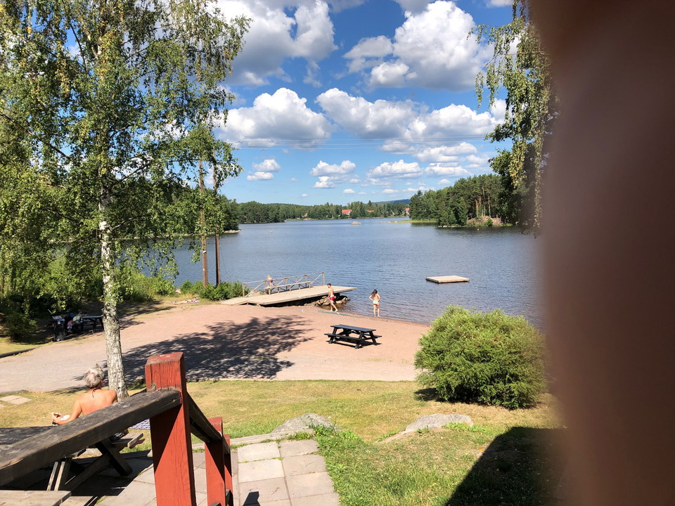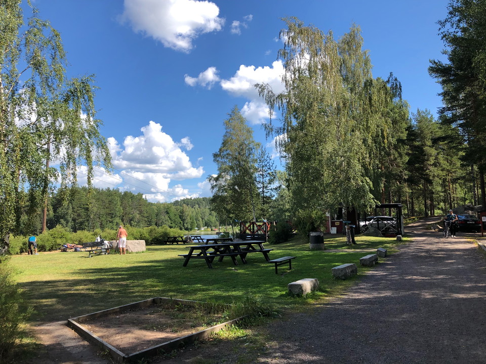 Grass areas, jetty and small beach with beach volleyball court right next door. There is also a barbecue area and toilet.