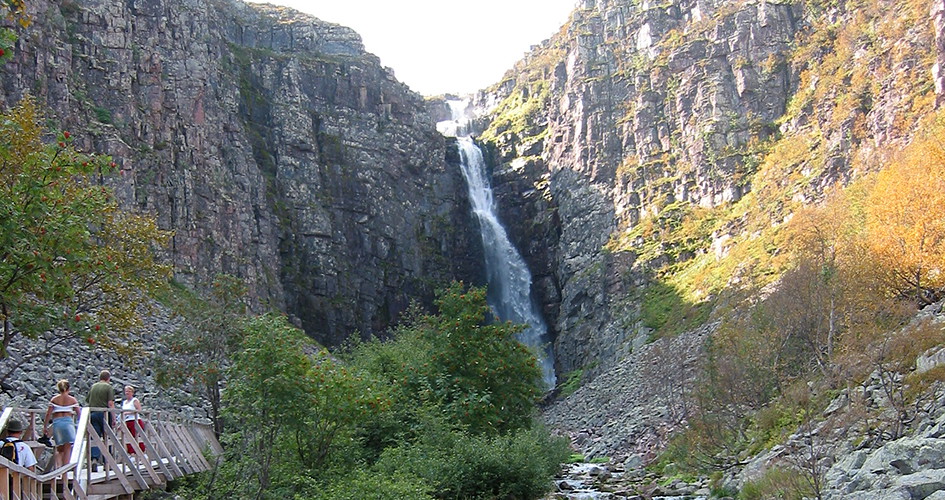 Njupeskär is easy to walk to during the bare ground period, and only low shoes are needed. The trail is graveled and boarded. Ask at the visitor center before you set out, because the trail is a bit steep in places.
