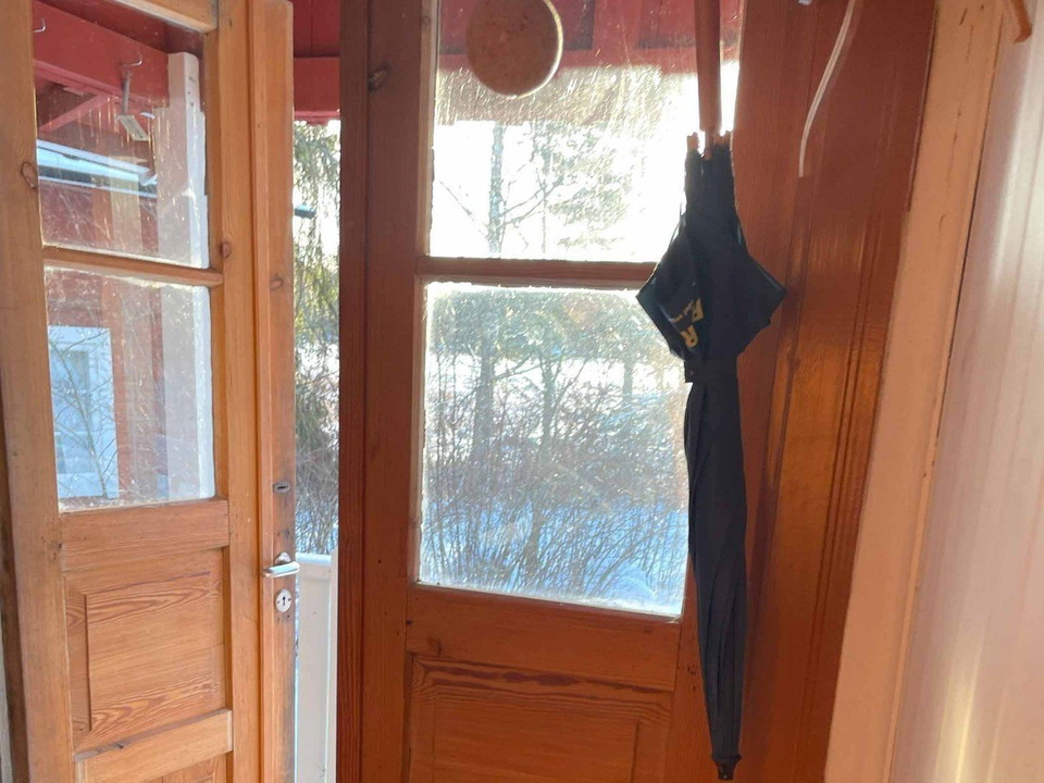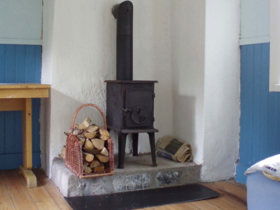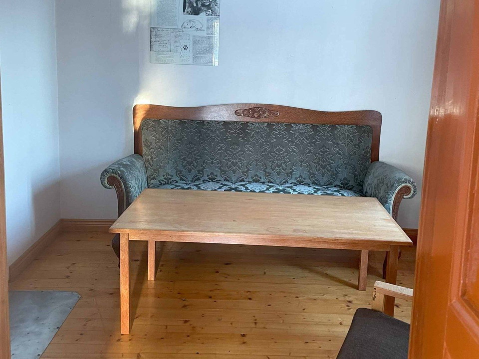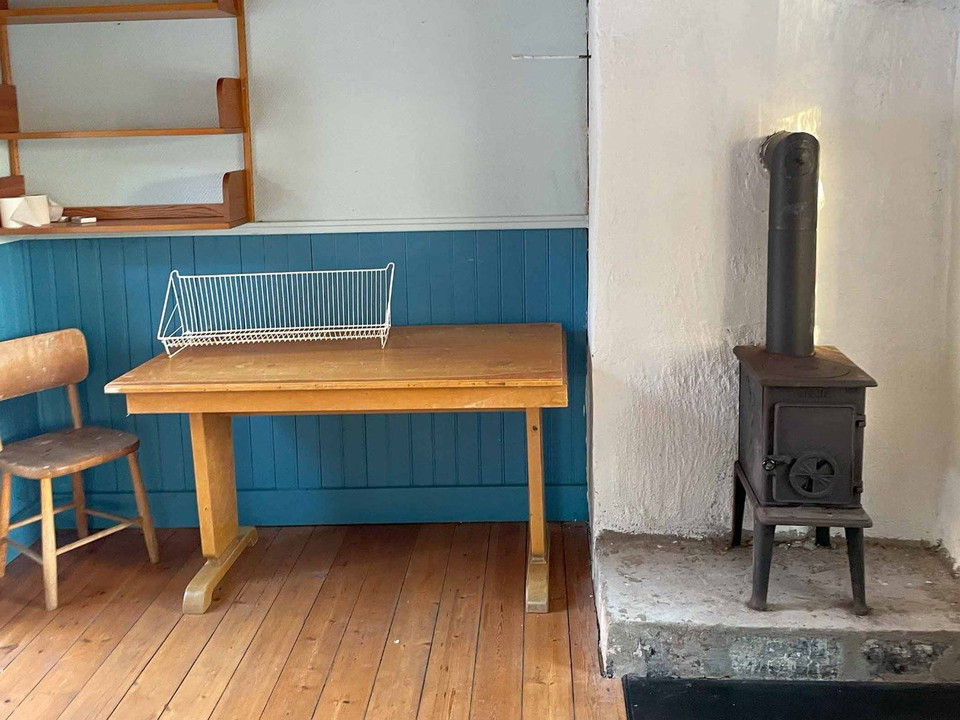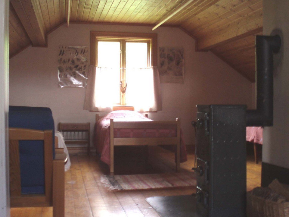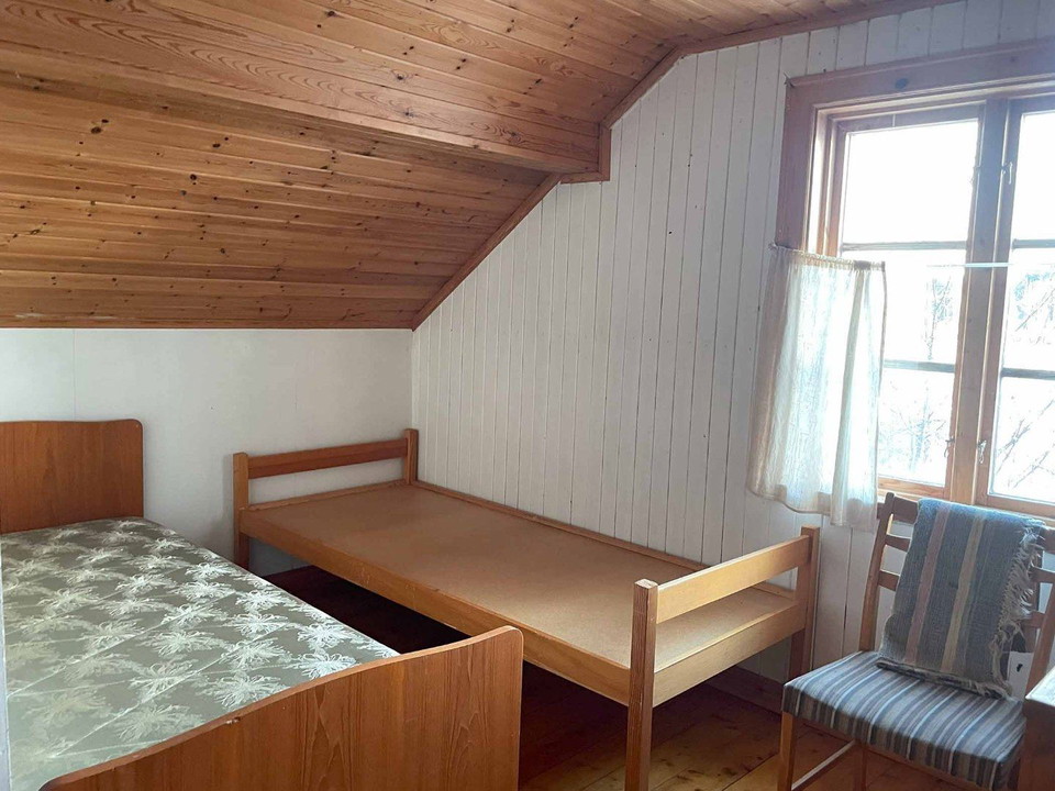The cabin has six beds and is a charming two-story house. The ground floor features a spacious kitchen, a small hallway, and a sitting room. Upstairs, there is a combined bedroom and living area. In the small adjacent cabin, there are two additional beds.