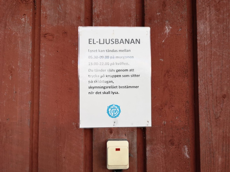 There is electric lighting that is turned on manually by the person who is going to use the electric light trail in the dark. The switch is located at Delsbo IF's warming hut at the start. It is the house closest to the outdoor pool. The electric light trail is tracked for classic skiing and skating when snow is available.