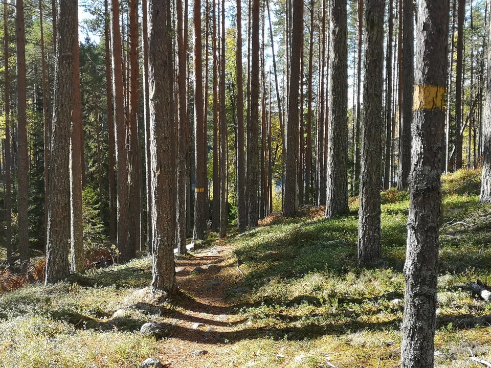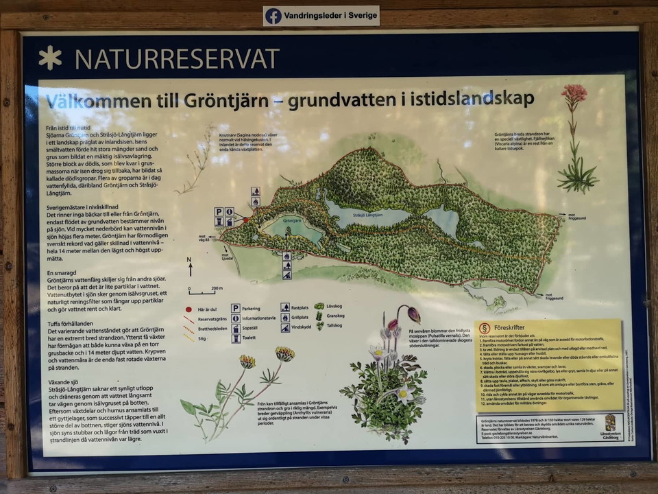Nice hiking trail from Bratthé and around and through Gröntjärns nature reserve. The hiking trail starts at the exercise center at Bratthé where you can park. The trail follows wide, clear paths through pine forests. At Bratthé and Gröntjärn there are rest areas with fireplaces and outhouses nearby. Do not miss to see Stråsjö Långtjärn which also has a strange water flow, the lake grows because it has an inlet but outlet only at the bottom but it is clogged with leaves and hummus.