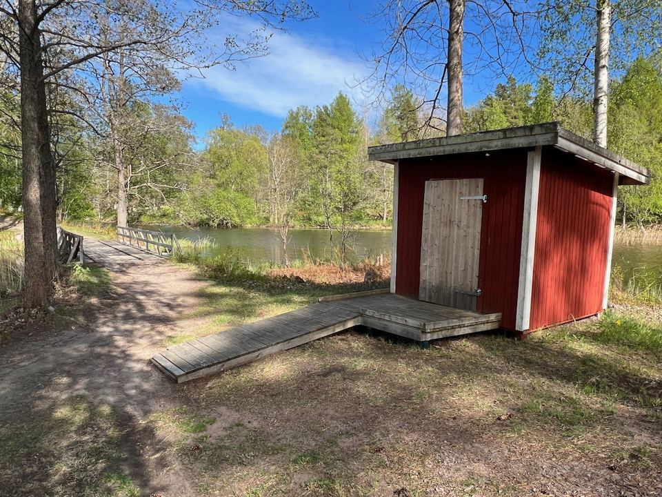 Badplatsen utgörs av en liten sandstrand, gräsmatta samt en kaj med trädäck. Parkeringsplatsen ligger ca 100 meter från badplatsen. Mellan parkeringsplatsen och badplatsen så är det grusväg, en lite bro samt stig. Vid badplatsen finns ett utedass med rullstolsramp som är öppen under badsäsong.