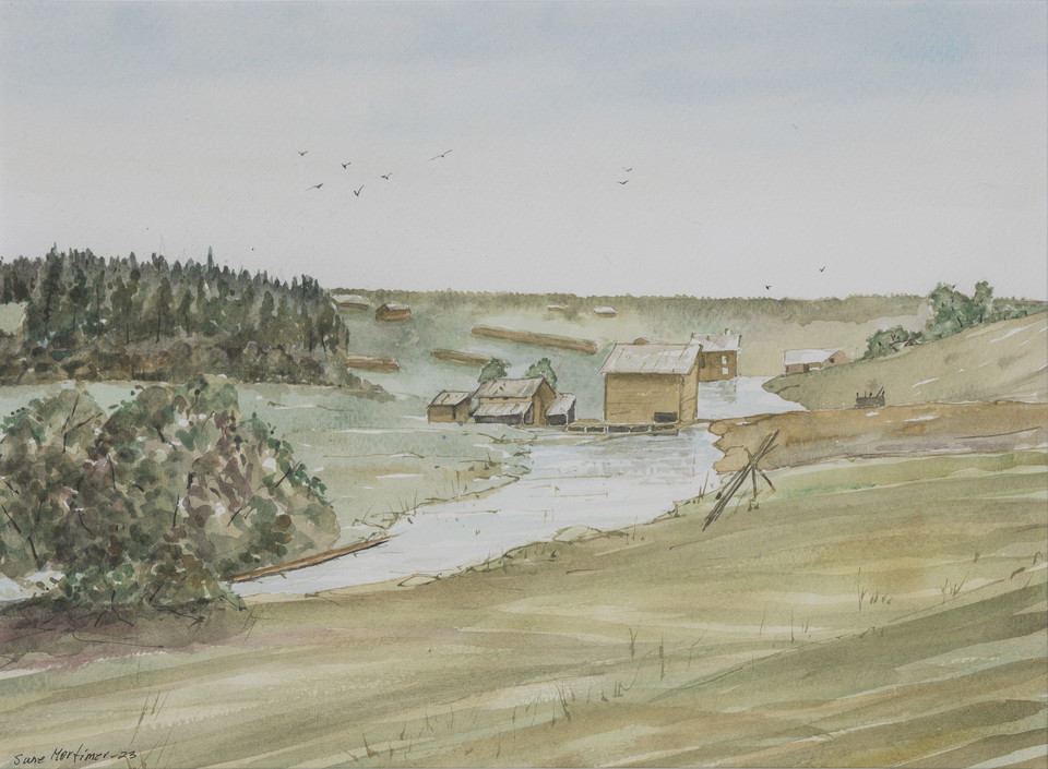 A photo from 1922 showing much that is not there today. In the background, downstream, you can see the mill building, which is the mill that was built in 1878 and which is still here today. In the middle of the picture, in the middle of the watercourse, is the Pallars shaft, which is still there today.
