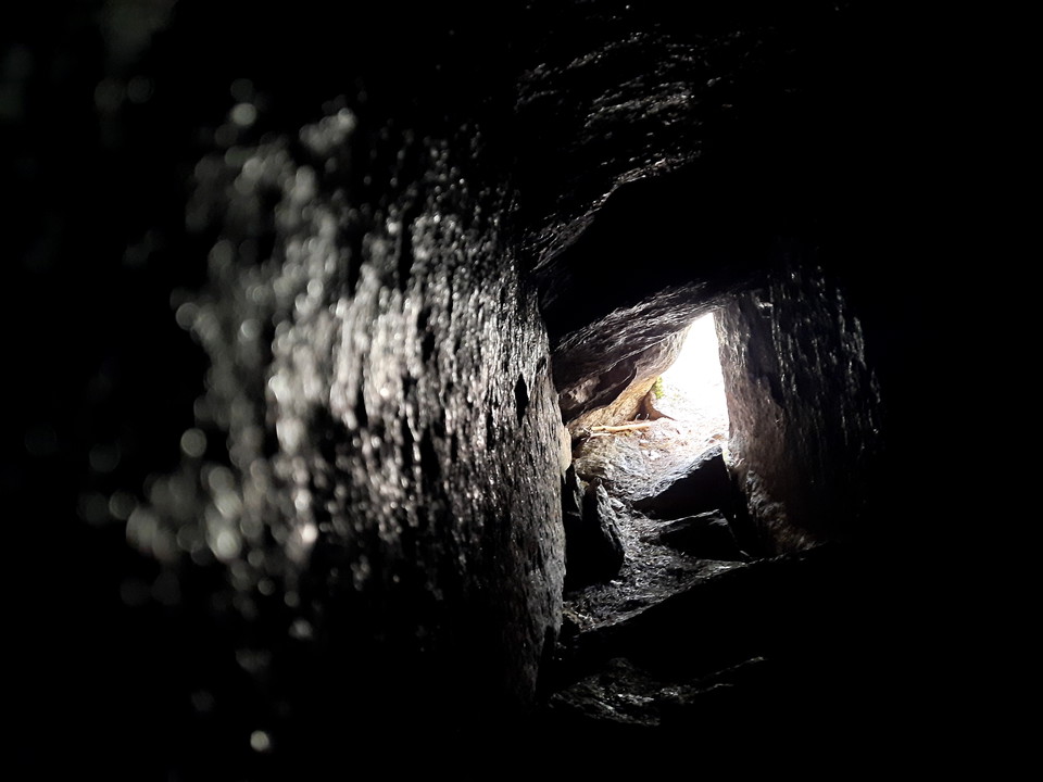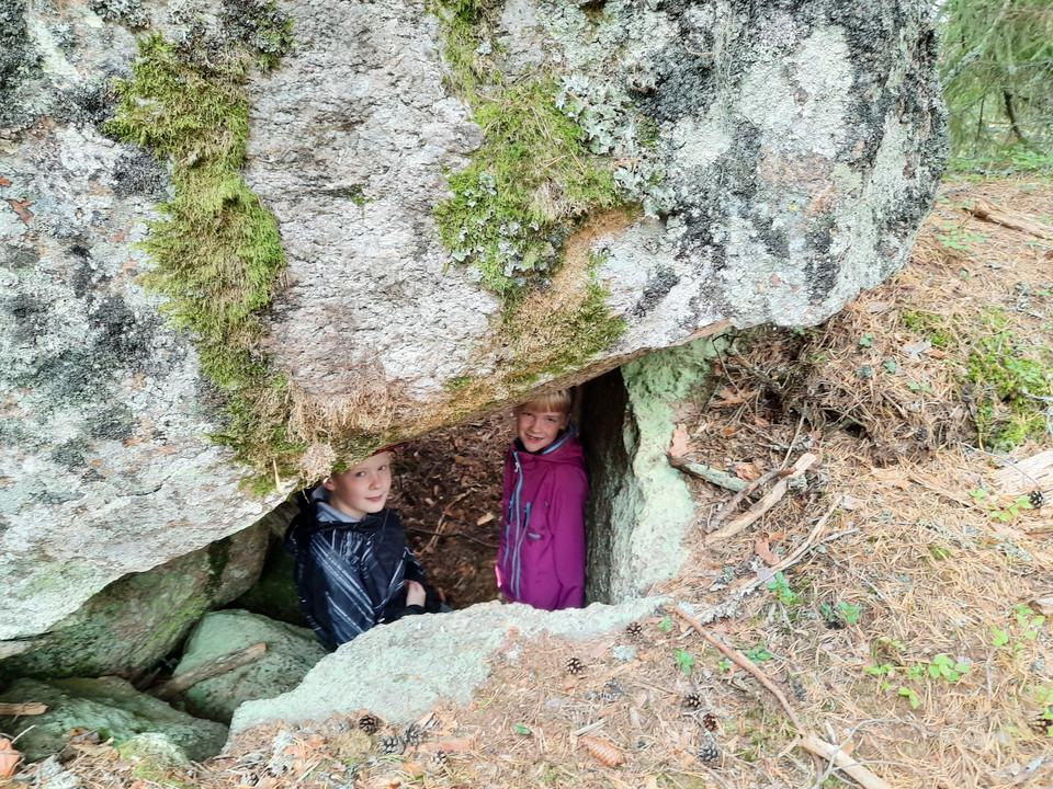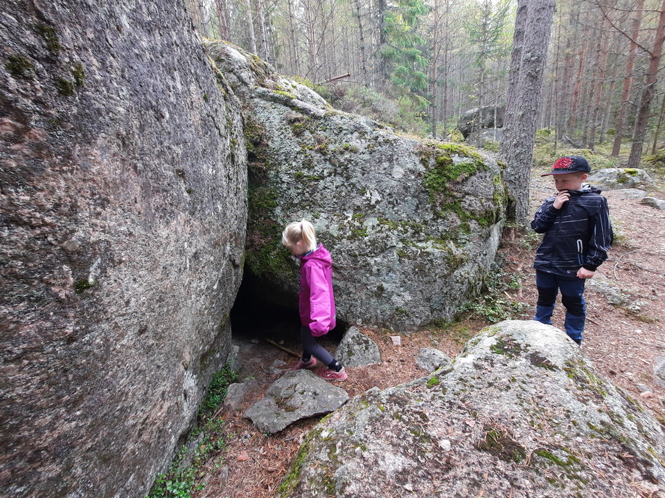 Halfway up Skallaberget there is a cozy cave to crawl into. The opening is clearly visible on the left side of the path if you walk from the bottom up. The opening is the smallest passage, then the cave opens up into a longer passage and below it a larger room, and inside another 1-2 smaller rooms.