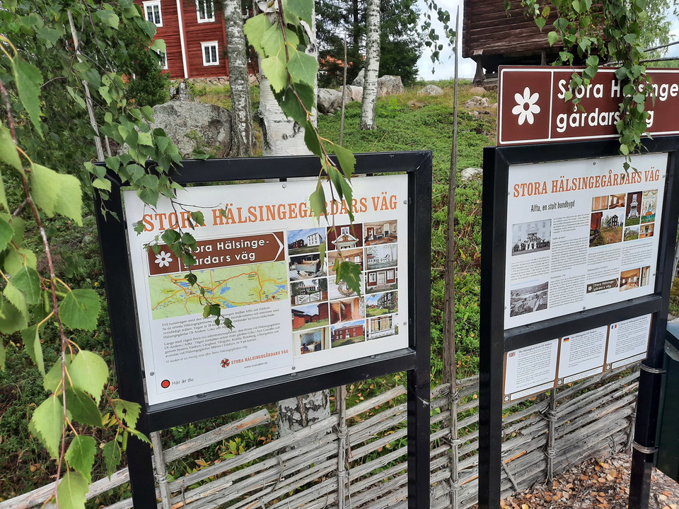Det finns nio rastplatser längs vägen med information och historia om byarna och de stora Hälsingegårdarna. Kartan visar var de finns efter vägen.
