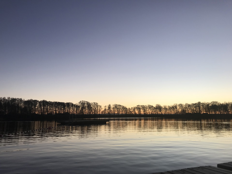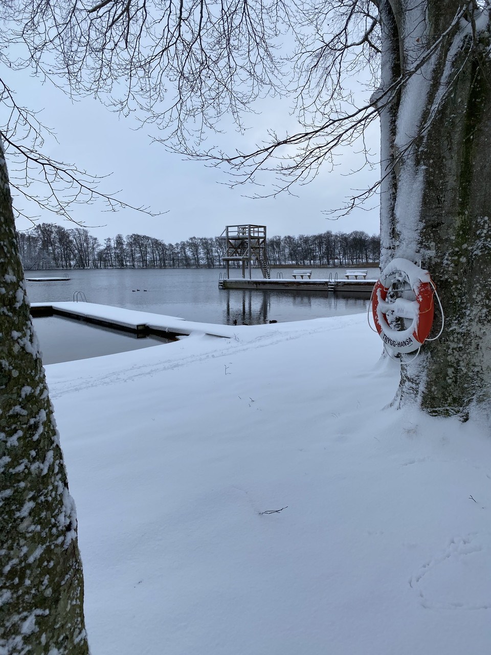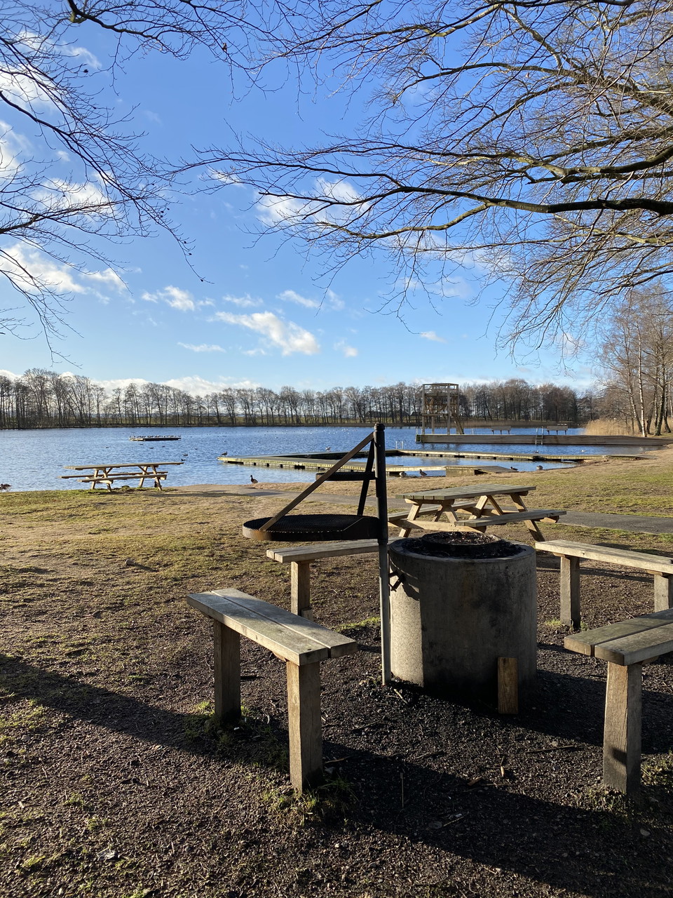 Lake with jetty and diving tower.