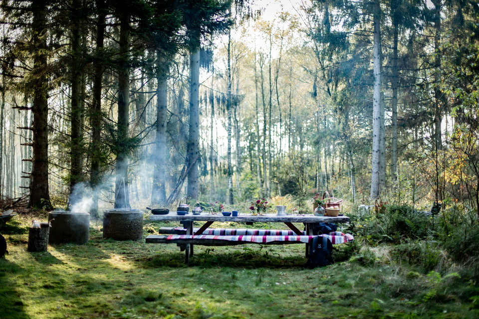 The food is cooked from locally produced ingredients from food producers in the Falkenberg area and Halland. They are complemented by what can be found in the forests and on the grounds depending on the season; i e blueberries, wild raspberries and chanterelles. Food is prepared over an open fire, on a fire range or trangias together with Susanne, who runs Camp Hakestad.