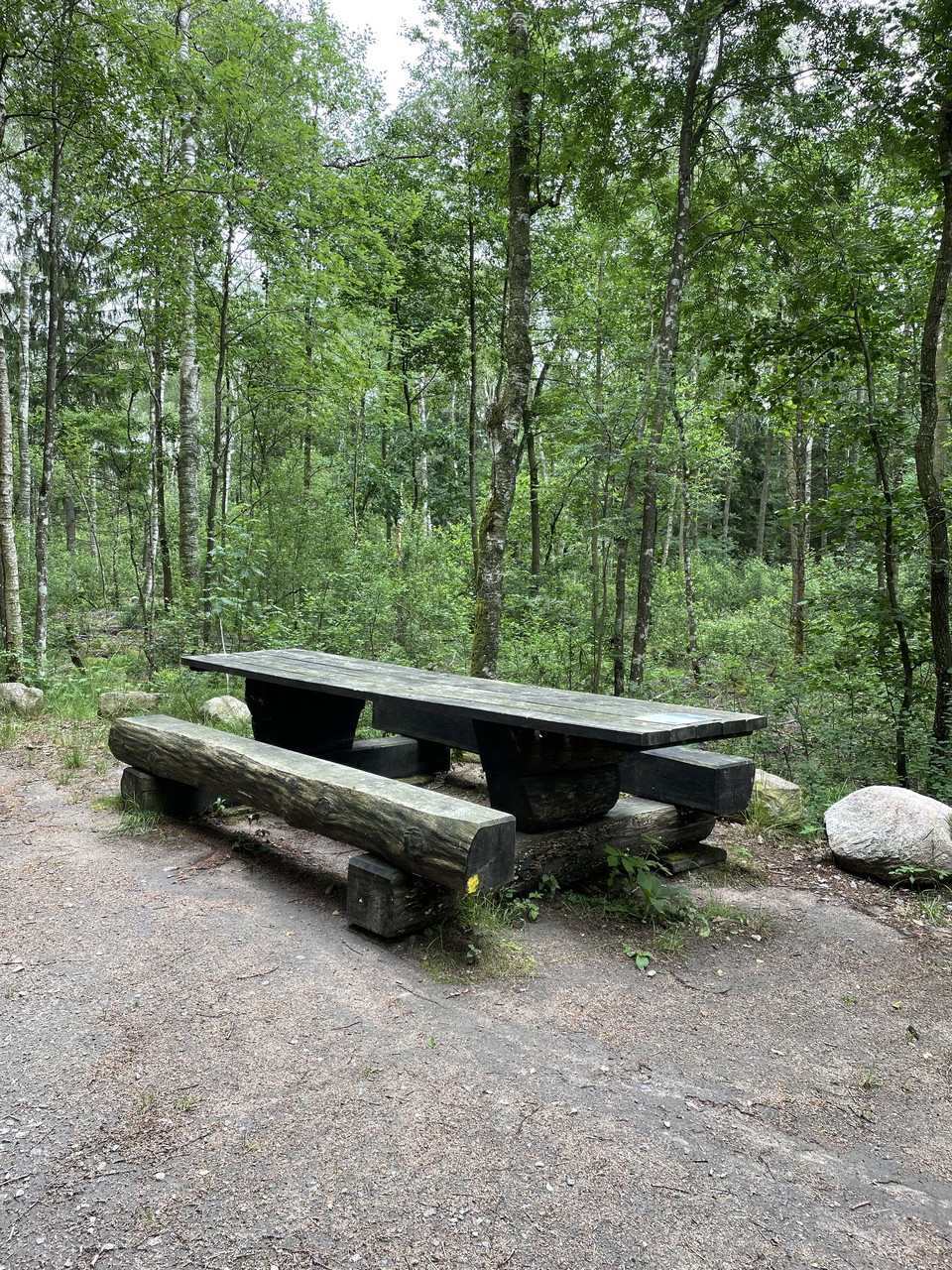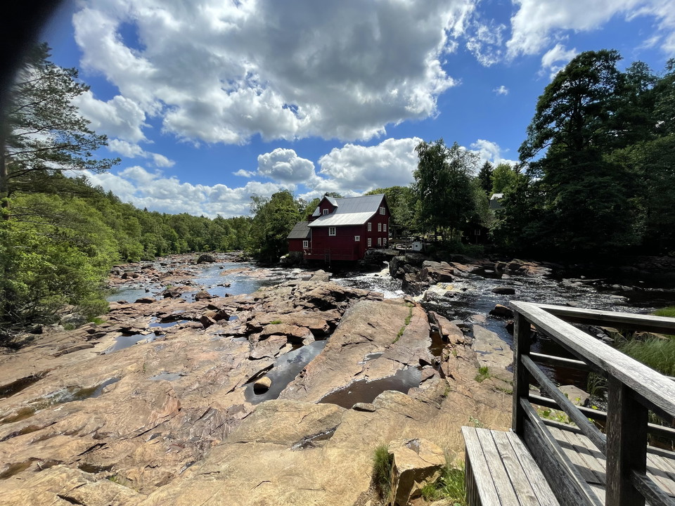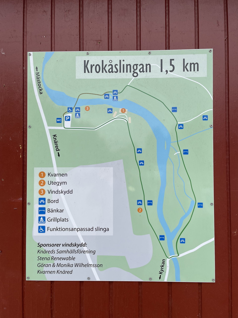 Cross the suspension bridge at the parking lot to reach the large barbecue area located down by the river, opposite the mill. There is a barbecue area, bench tables, toilets and bins. The roaring Kvarnfallet in Knäred is a scenic place where you can have a coffee, barbecue, swim or just sit and admire the flow of the Krokån river past the 400-year-old vicarage mill. From here you can also hike several different trails.