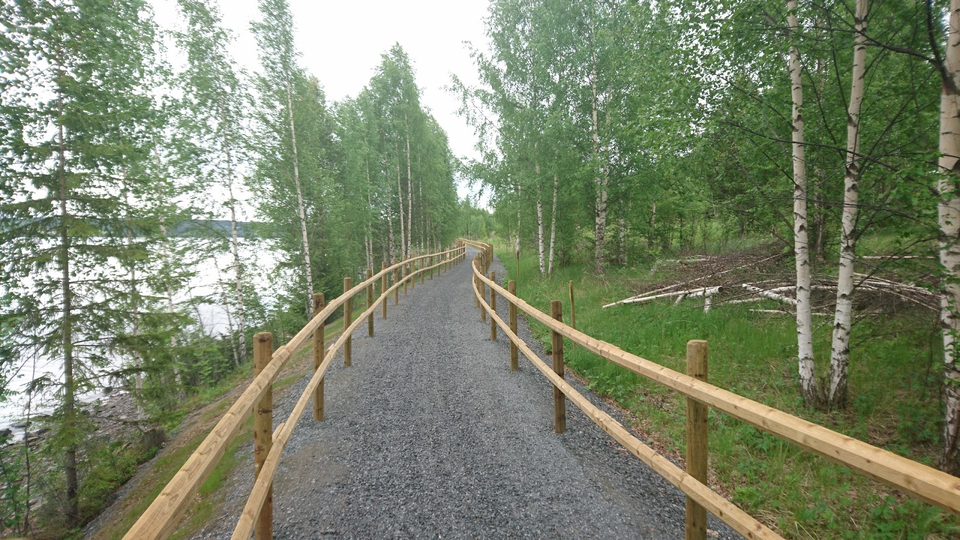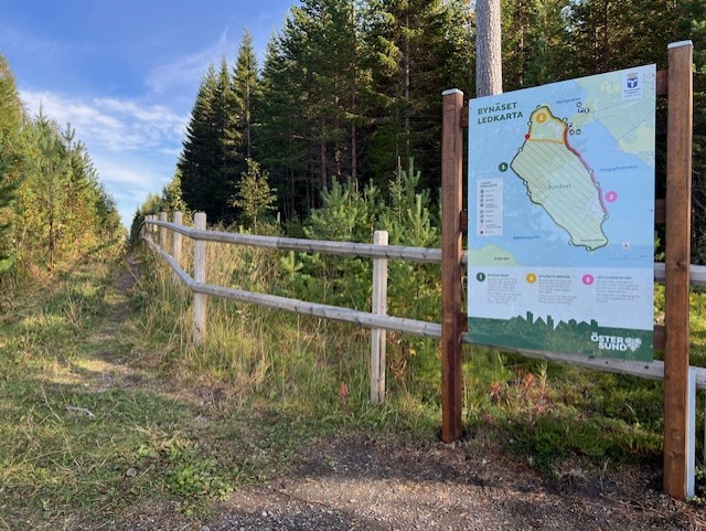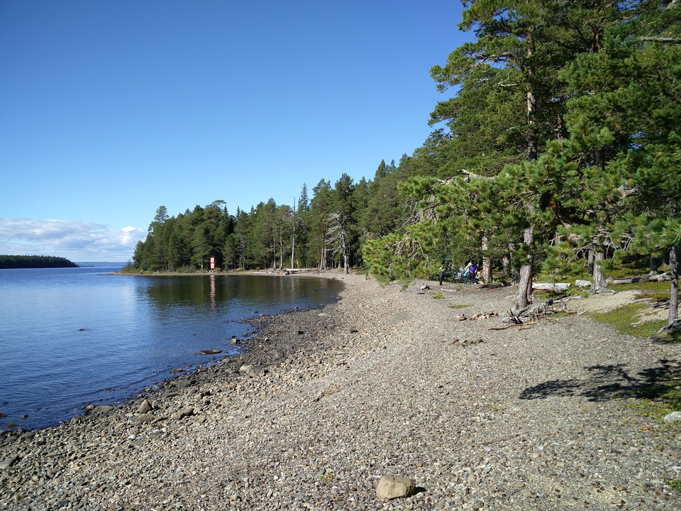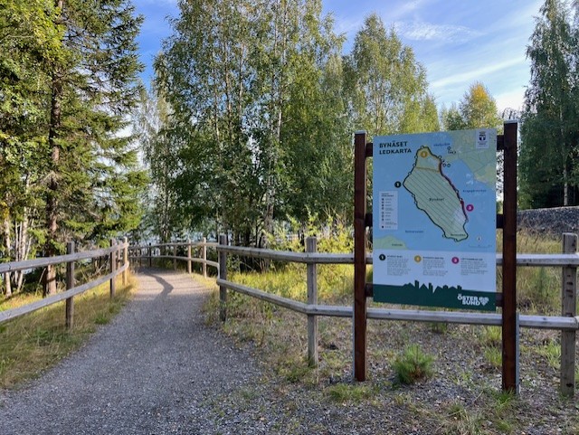 A nice trail that goes around Bynäset. Mostly the trail goes close to the water with very beautiful views of the lake and the mountains. The southern end of the trail is accessible with a gravel path about 2 km long that leads to a rest area with bench tables by the shore. The rest of the trail is a forest path where there are a lot of roots and in a few places a little wetter surface.