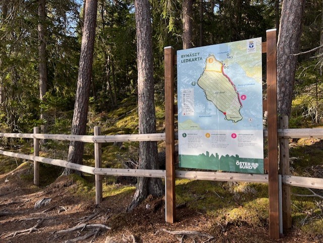 Bynäset is a former military area that is partly open to the public. The areas that are still forbidden to enter are delimited by wooden fences. Inside the wooden fence there are yellow prohibition signs.