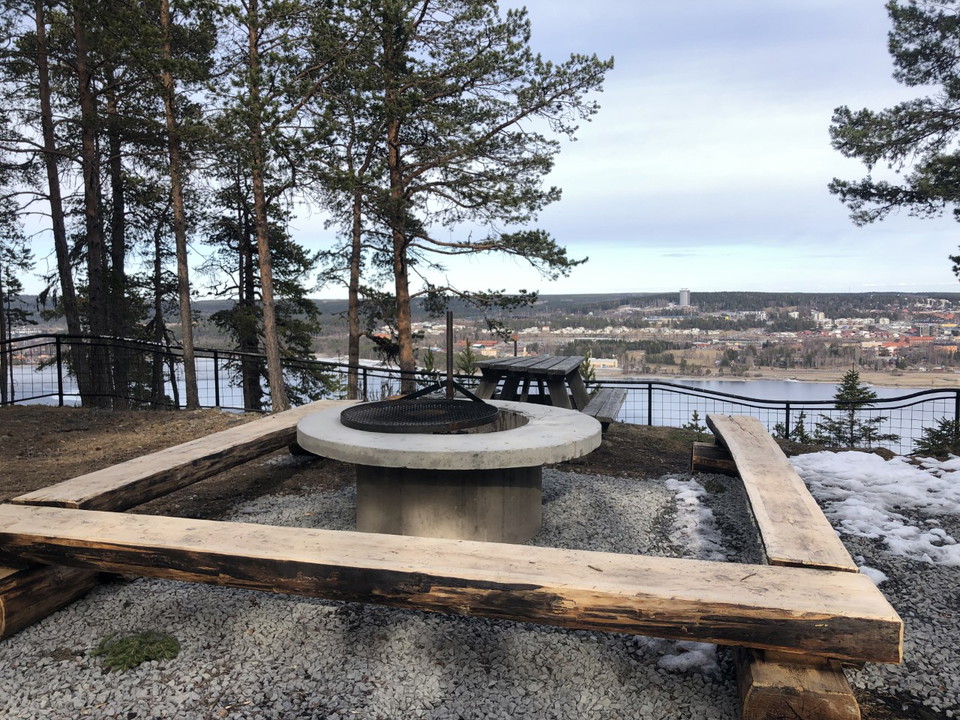 A barbecue area with benches built in the fall of 2022. There is a cement grill with benches around it. From the barbecue area you have a nice view of Östersund city.