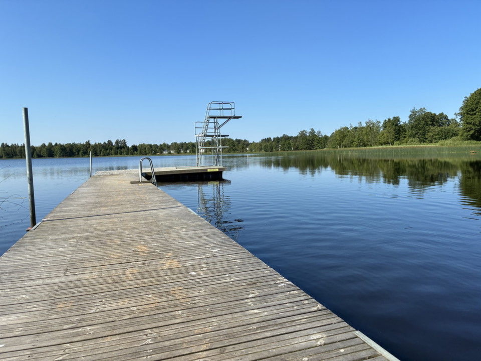 Badbrygga och hopptorn nära camping, med egen omklädningshytt, WC, utedusch och handikapp-ramp.