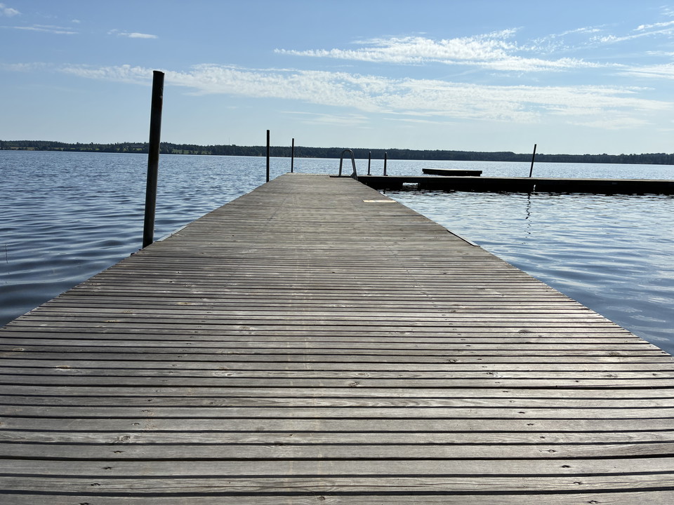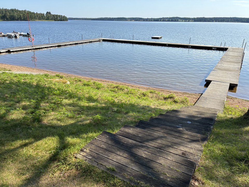 Bathing jetty adjacent to visitor center, with changing cabin, WC, outdoor shower and playground.
