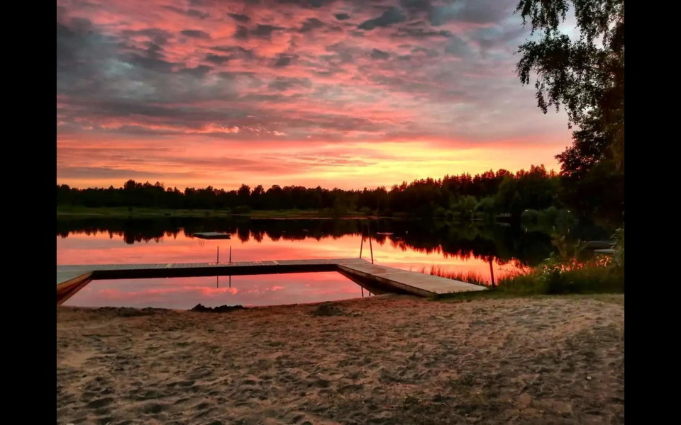 The bathing area has a jetty, a raft, a small changing cabin and a bathing hut.