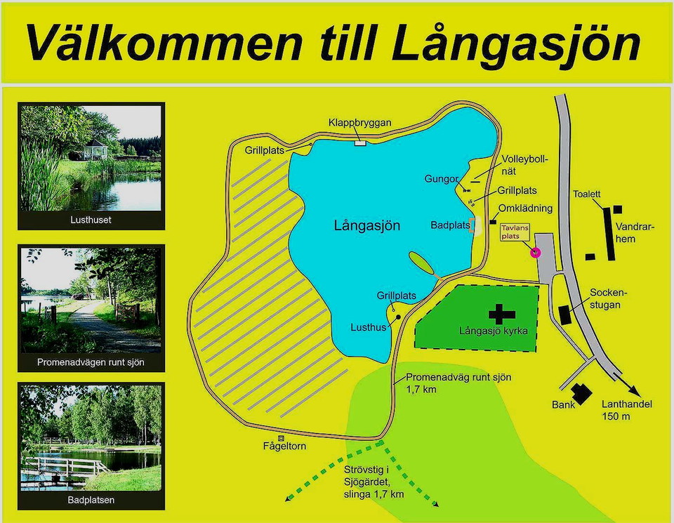 Lake Långasjön, in the middle of the village, is a scenic recreation area with a walking trail 1.7 km around the lake, through pasture with oak and beech and beach vegetation with alder, willow and birch. High bird tower at the southern end. On the eastern shore of Lake Långasjön there is a playground, gazebo, barbecue areas and swimming area. Implanted noble fish with fishing opportunities. The lake was restored in 1987, after having been almost completely overgrown due to several lake lowering.