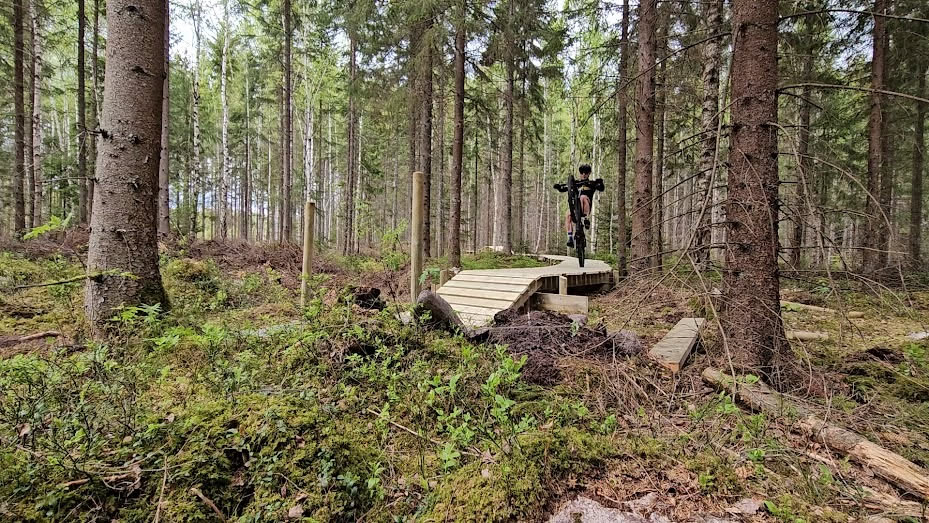 Next, the R.I.P follows the same route as the Butcher. Here you also enter the residential areas (take the first left and then left again on the bike path). For a short distance, the trail shares the same route as the Emigration Trail bike path. Soon the R.I.P. continues onto the technical and messy path that Butcher is named after. The outer lap takes you north over the Sträva gravel road and onto the Strava segment "Sthil" and over the long bridge in the northern part of the area. At "Lekparken" which is a hill in the middle of Sträva forest, choose the more difficult descent, there is a shortcut if necessary if you do not want to run from the top stone slope. Then cross over a wider exercise track, to finish with a 45 meter long bridge called Shongololo (centipede) before taking a detour via Vitmossen and FOX to the bike meeting point.