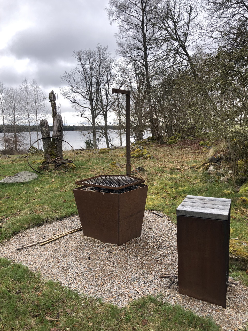 The barbecue area with adjacent bench table is located at the old farm on the island.