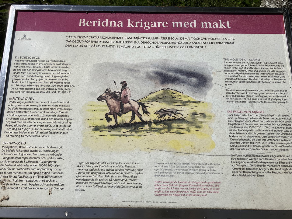 Mjäryd's hills in Ljungby municipality is a burial ground with around 175 graves, of which 130 are mounds from the Late Iron Age. There are also stones from the older Iron Age here. Among the hills rises the so-called Jättehögen, a mighty tomb decorated for an important man or woman.