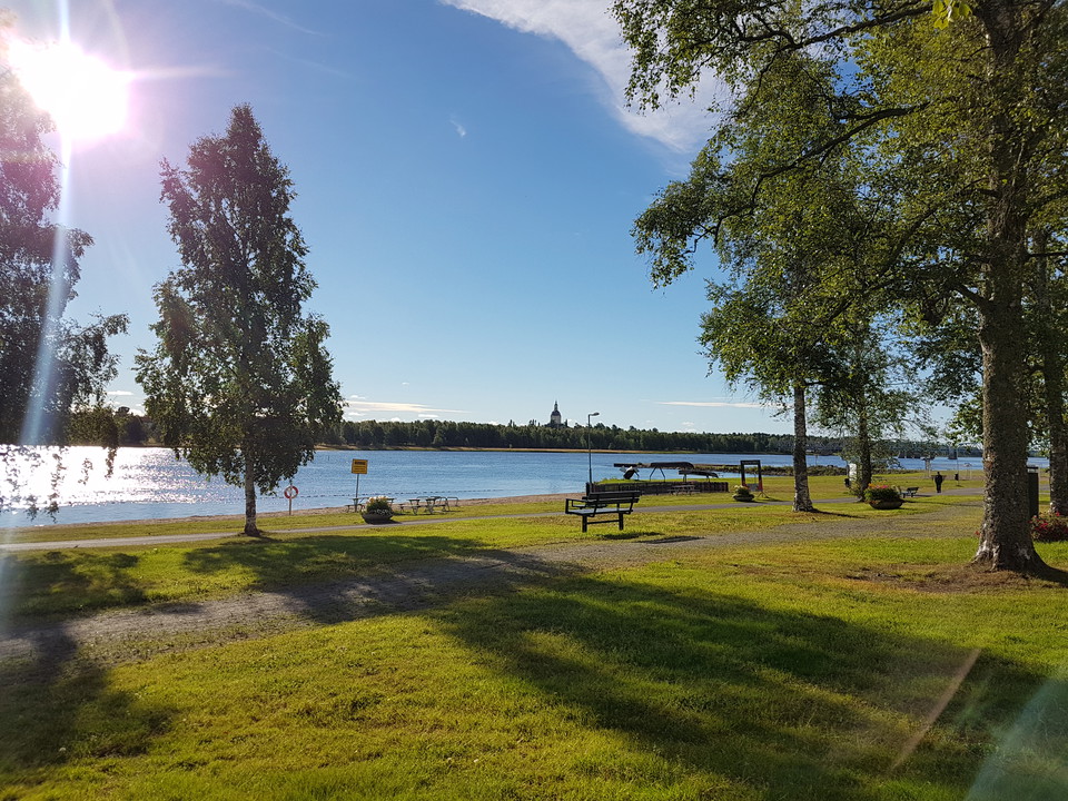 A nice and child-friendly bathing place in the center of Haparanda. Beautiful view over the river to Finland and Nedertorneå church.