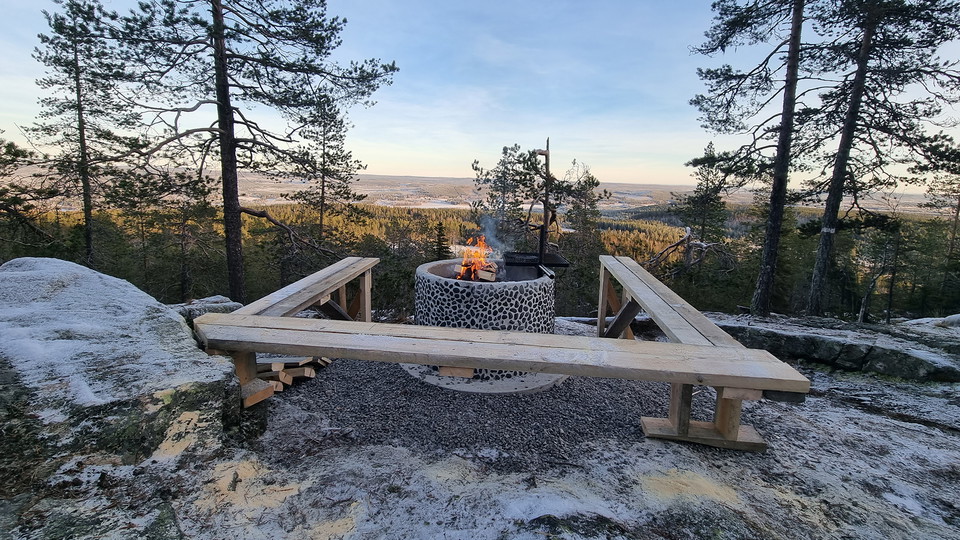 A fireplace with benches further east along the trail. There is a woodshed near the fireplace at the top. It is empty at the moment, but it will be filled with wood as soon as possible during winter 2022/23. Until then, you need to bring your own wood if you want to make a fire.