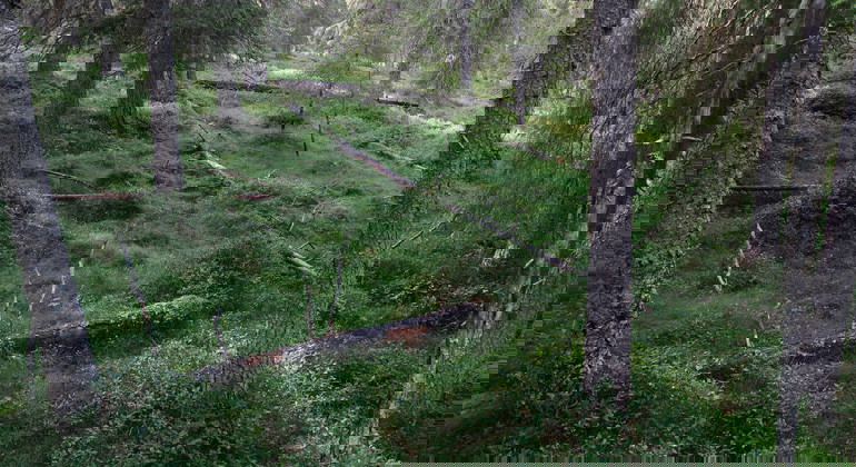 Surrounded by extensive wetlands, the forests of Njuollavárrie are vital for local flora and fauna, with a portion of the Saltmyran wetland complex included in the reserve's northwestern corner. Traces of human presence can be found throughout the area, including a hearth in the northern part, possibly the oldest evidence of human activity here.