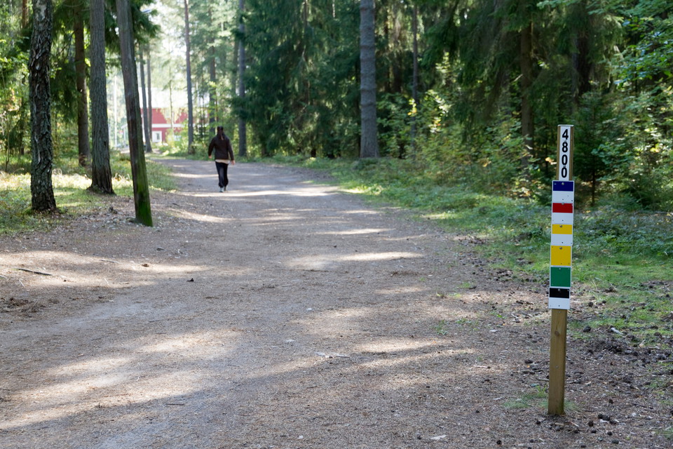 Gått 1,2 km. Kuperat. Många rast-/fikaplatser längs vägen. Tydliga markeringar för spåret men bara åt ett håll.