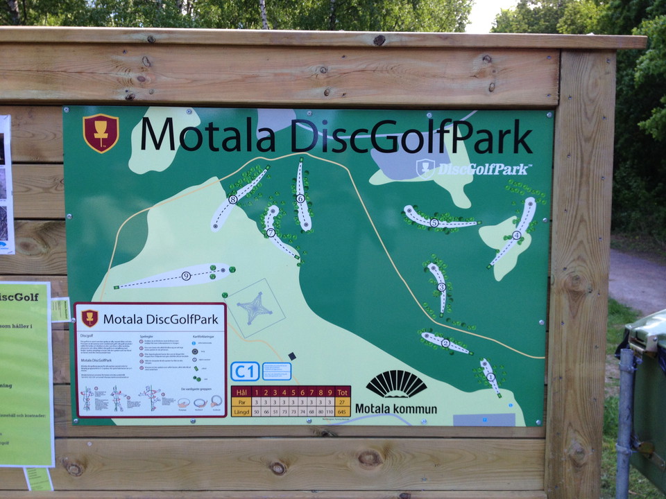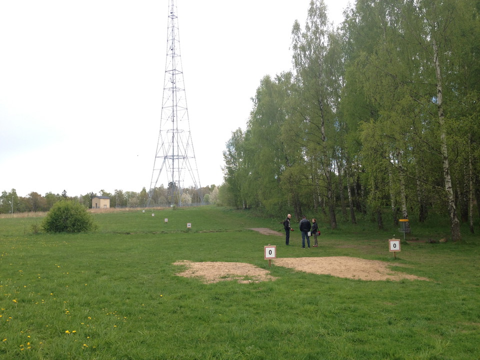 Bondebacka has a nine-hole disc golf course that stretches through the lush and shrubby environment south of the radio masts. The start of the disc golf course is located at the parking lot of the radio museum. During a trade fair, Motala municipality's leisure activities came into contact with a company that constructed disc golf courses in several cities in Sweden, and this resulted in a collaboration. In the fall of 2013, a nine-hole course was planned. Work began on widening and laying a better surface for a 2.5 km exercise loop. The course was completed early, in spring 2014. The disc golf course was then inaugurated in June 2014.