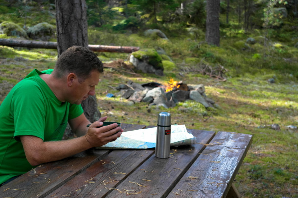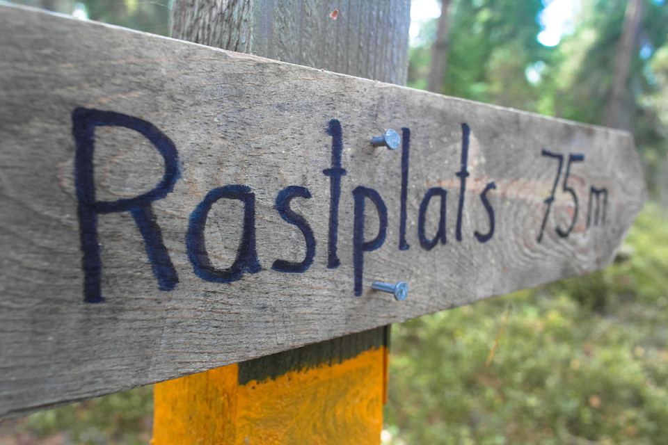 The rest area is located in a small opening in the ancient forest. There are tables and benches and a fireplace if you want to grill a sausage.