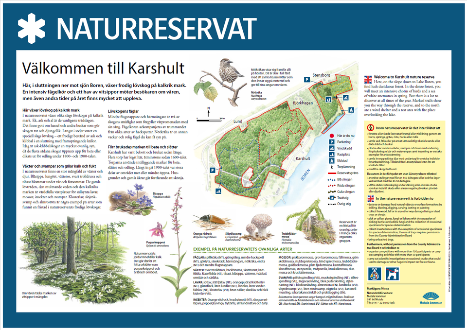On the northern shore of Boren, near Motala, you will find Karshult nature reserve. A dense and beautiful deciduous forest cover most of the reserve with ash, alder, elm and oak as the most common tree species. The area is characterized by animals and plants that thrive in a humid and calcareous environment. As a visitor, you can enjoy beautiful nature trails in welcoming and vivid greenery, or head down to the water where you will find a grill and some benches. The birdsong is always close and loud with species such as Wood Warbler, Blackcap and Lesser Spotted Woodpeckers. When the European birdcherry (Prunus padus) bloom, the scent is strong and the buzz from the bees vibrant. Welcome!