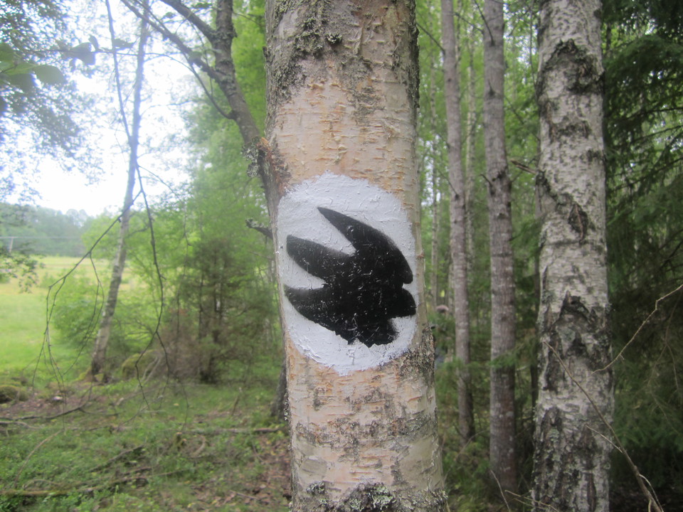 The nature trail is marked with white rings, in the middle is a black falcon painted. This is the symbol of the Swedish Society for Nature Conservation. It is the Nature Conservation Association in Norrköping that manages the beautiful meadow you will pass. It is also the association that, together with Norrköping municipality, has developed this nature trail.