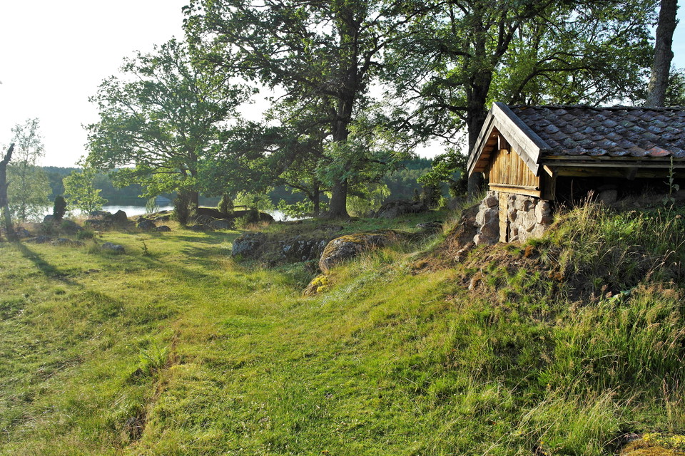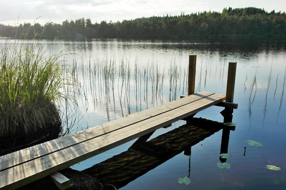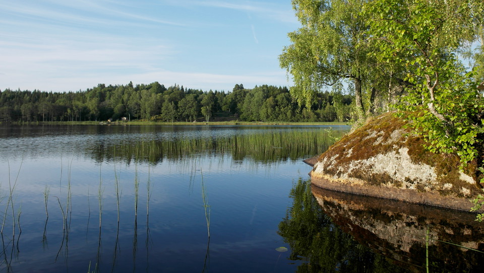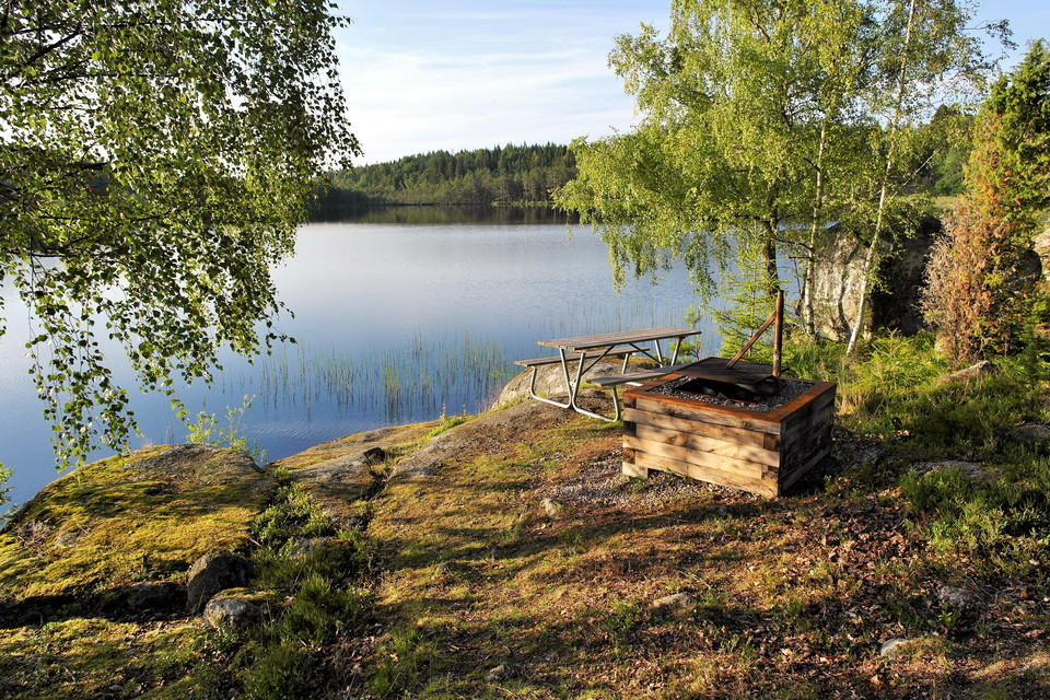 At the shore of Stensjön, below the gray farm, there is a picnic area with bench tables, a fireplace and a small jetty.