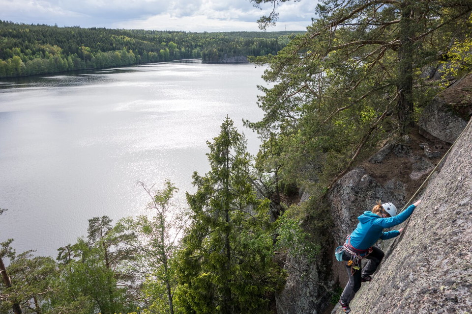 The slab is located at the top of the right edge of Stora berget and there are fantastic cracks and climbing on fine slabs. A sva is a surface that does not slope much but still requires good footwork as you have to rely on the friction between the shoes and the rock. The rock dries quickly and the view from the top is magnificent.