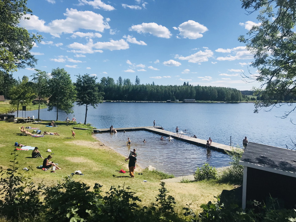 Här finns brygga, omklädningsrum, bord, bänkar och toalett.