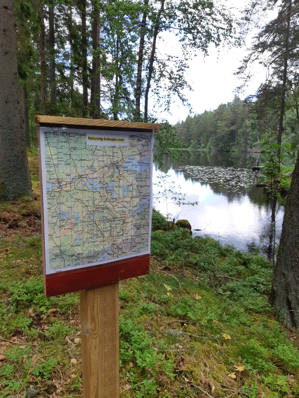 Very nice hike along the shore of Grävsjön and on through the picturesque community of Högsjö with mill area. Along the trail there are four barbecue areas, a windbreak and jetties for fishing or swimming. Dry toilets are available adjacent to the parking lot.