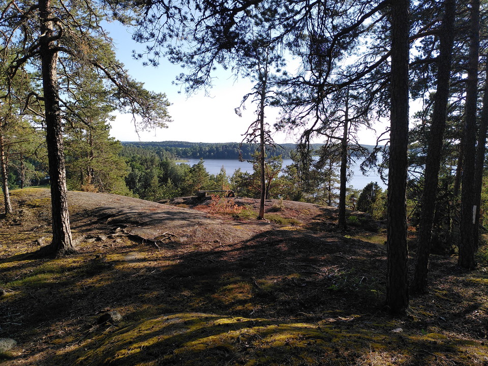 Long, beautiful view of Torpfjärden/Långhalsen on a nice rocky mountain top.