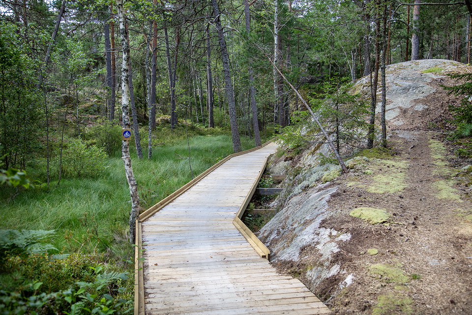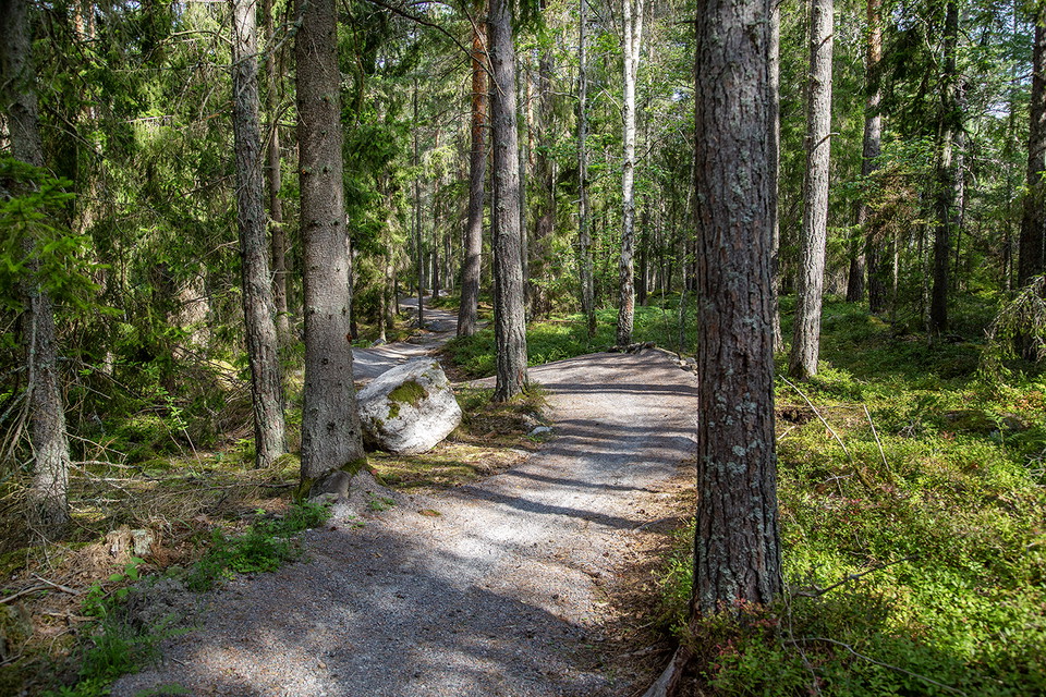 In the centrally located Vitalis Forest in Trosa, there is a 1.7-kilometer-long MTB trail. The trail is rated blue in difficulty, with elements of green, and it naturally winds through the landscape of Vitalis forest. The surface consists of gravel mixed with natural terrain. Blue arrows indicate the direction for cycling. Please follow the direction of the arrows to enhance safety.