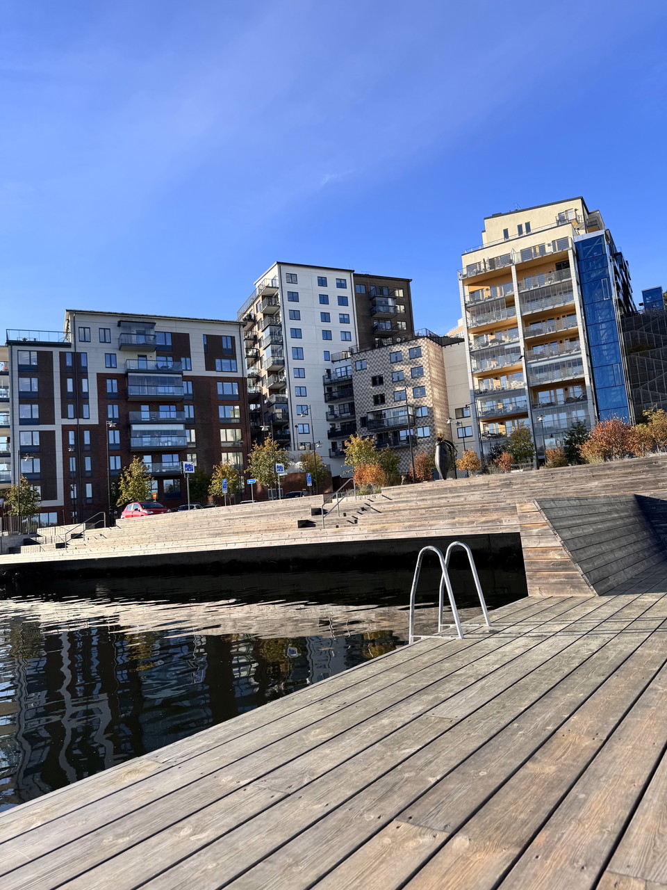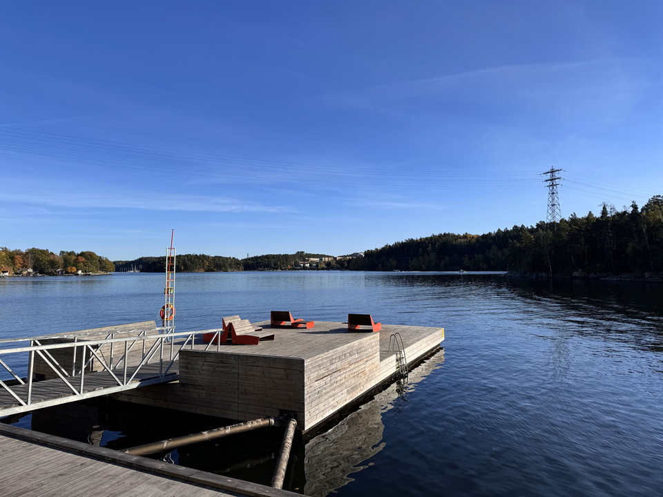 Jetty with sunbeds and bathing ladder. A stone's throw from the restaurant Bruket and Kennys Gelato and Mårtens Holme.