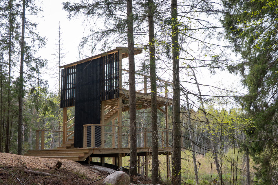 The bird tower is located in the forest in the lower corner of Rudsjön on a small hillock. From here there is a good view of the entire wetland and the alder swamp forest. The tower is built on two floors, where the second floor has a windbreak at the back edge and a smaller roof.