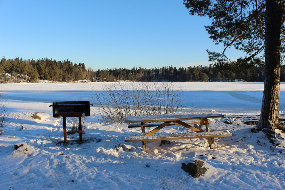 Barbecue area with table and firewood right by the lake. Can be turned around both in summer and winter.