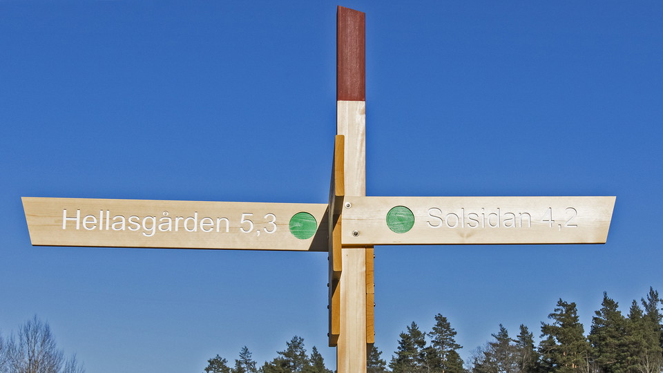 Hellasgården, on Ältavägen, is easy to get to by bus. There is also a large parking lot. If you want to take the trail in the other direction, you can start from Solsidan station (Saltsjöbanan), follow Erstaviks kvarnväg to its end and then continue on the footpath and cycle path into the forest. It is also possible to get on the trail in other places, e.g. via Erstaviksvägen from Östervik-Drevinge.