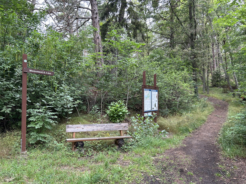 There is parking, access to a jetty, and a short walk up a hill with a lot of roots there is a beautiful view of the fence and the monument. If you continue past the monument, there will be a large wooden staircase where you can walk further along the beach to Boo old cemetery, it is a forest path with stones and roots.